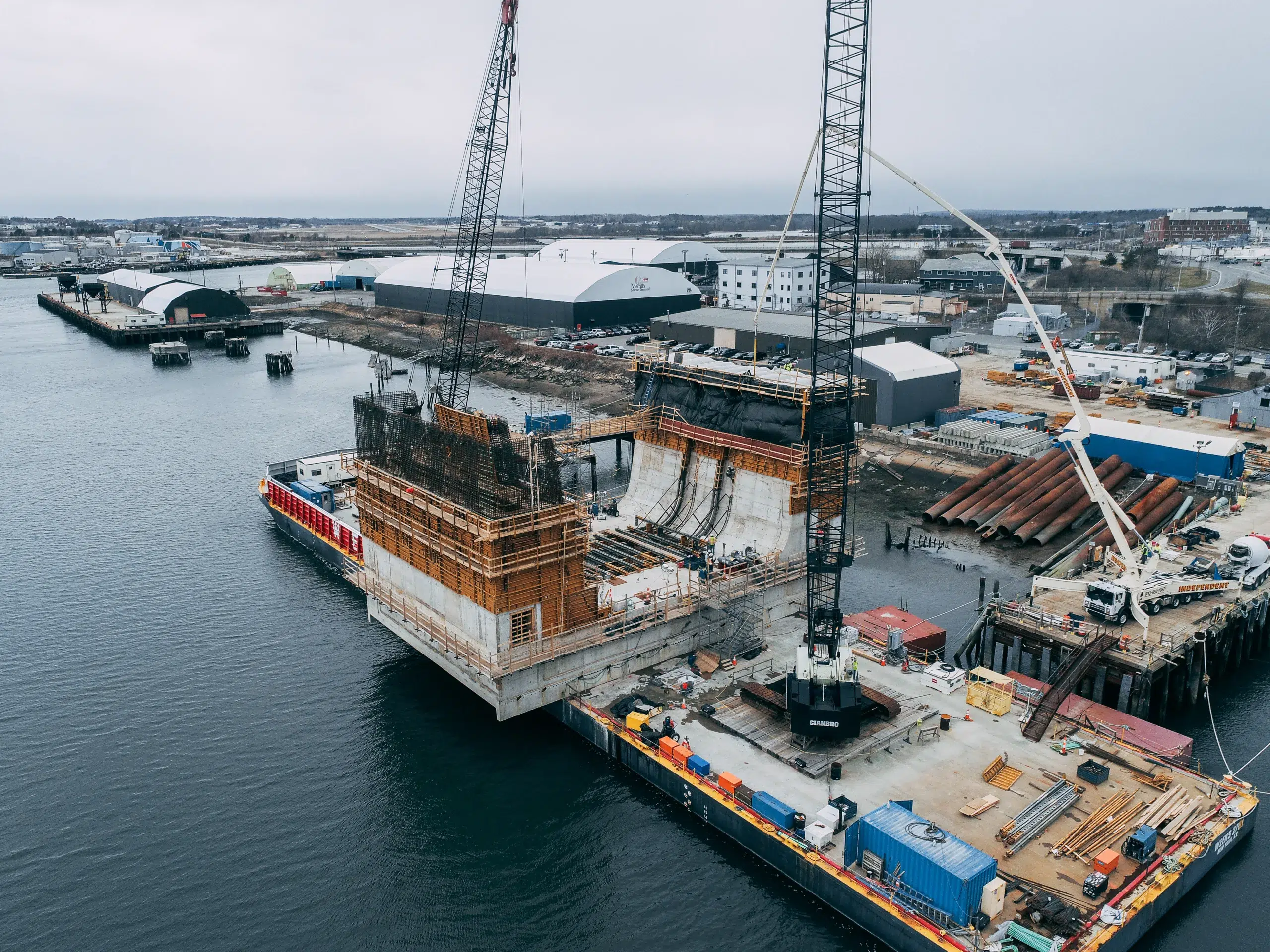Sebago Technics played a key role in supporting the construction team with on-site survey geometry control to ensure tight construction tolerances were met and maintained for the success of all the teams involved. A Sebago Survey-Geomatics Team member spent nine months on-site daily at the Cianbro facility, located on the waterfront in Portland, supporting the construction of concrete formwork and maintaining the on-site survey control located directly on the Super Flood structure itself, which was floating on a barge moored at the facility’s dock.